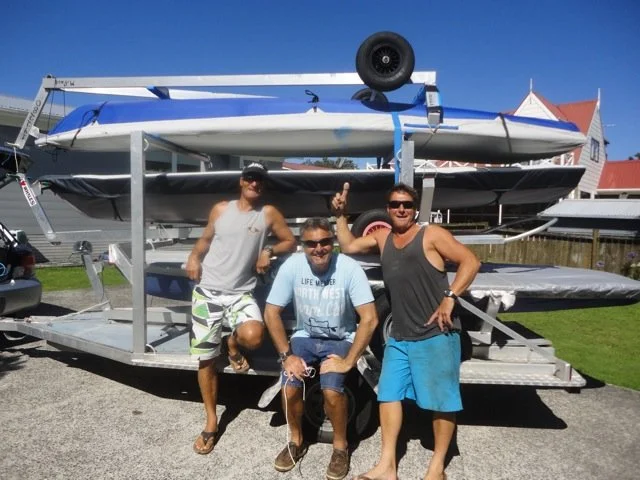 NZ Laser glitteratti and past World Champions Mark Orams, Murray Thom and Mark Page preparing to head south for the highly enjoyable NZ Laser Champs hosted by the hospitable Worser Bay on Wellington.